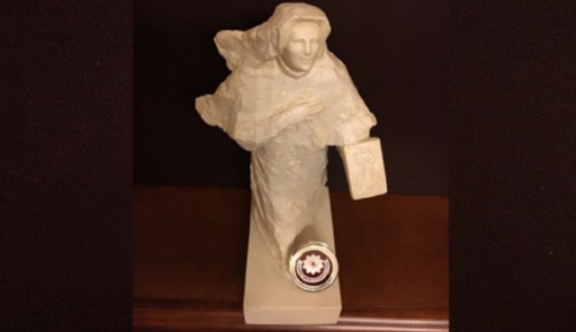 Figurkę ze sztucznego kamienia, a dokładniej połączenia mączki marmurowej i żywicy epidianowej, wykonała Krystyna Fałdyga-Solska, absolwentka Akademii Sztuk Pięknych w Krakowie i rzeźbiarka mieszkająca i pracująca w Łodzi. Jest ona autorką licznych pomników o tematyce sakralnej, m.in. św. Jana Pawła II, św. Maksymiliana Kolbe i św. Faustyny Kowalskiej.