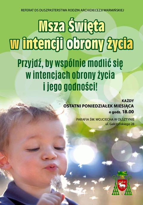 27 lutego o godzinie 18.00 w parafii św. Wojciecha w Olsztynie (woj. warmińsko-mazurskie) odbędzie się Msza Święta w intencji obrony życia i jego godności.
