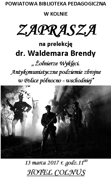 13 marca o godzinie 11 w Hotelu Colnus w Kolnie (woj.podlaskie) odbędzie się prelekcja dr Waldemara Bredny ,,Żołnierze Wyklęci.Antykomunistyczne podziemie zbrojne w Polsce północno-wschodniej".