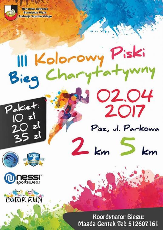 Już jutro (2.04) o godz.11 przy ul.Parkowej odbędzie się III Kolorowy Piski Bieg Charytatywny.Ma on na celu pomoc chorym Piszaninom (Oliwii,Mateuszowi,Zosi,Kornelowi,Michałowi i Lenie).Honorowy patronat nad wydarzeniem objął Burmistrz Pisza-Andrzej Szymborski.