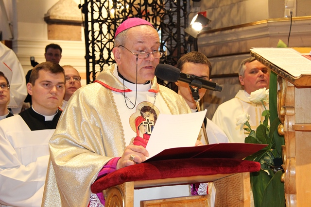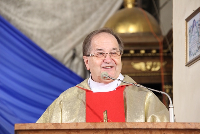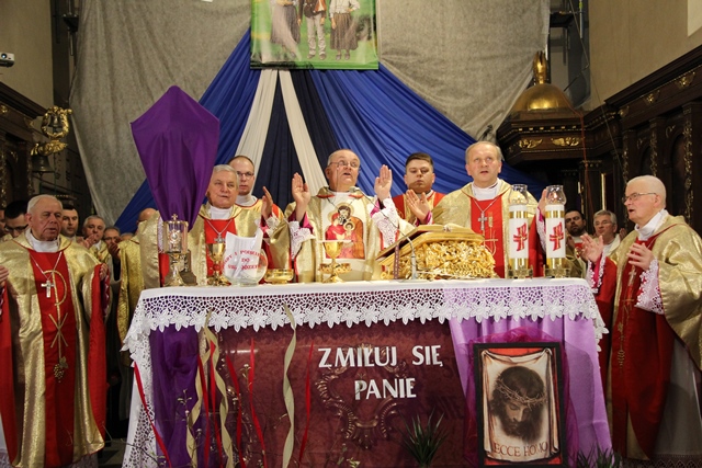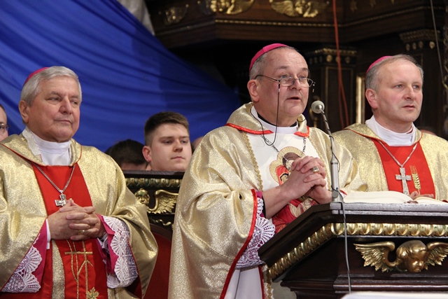 Mszy św. przewodniczył bp Michał Janocha, biskup pomocniczy archidiecezji warszawskiej, przewodniczący Rady ds. Kultury i Ochrony Dziedzictwa Kulturowego, na polu naukowym specjalista z zakresu historii sztuki i tradycji bizantyjskiej oraz teologii kultury. Wraz z nim modlili się: biskup kaliski Edward Janiak, bp Łukasz Buzun, bp senior Stanisław Napierała, bp senior Teofil Wilski, wikariusz generalny ks. prał. Andrzej Latoń, o. Tadeusz Rydzyk, kilkudziesięciu kapłanów, wierni z diecezji kaliskiej, a szczególnie dekanatów bolesławieckiego, pleszewskiego i zdunowskiego oraz pielgrzymi z całej Polski. W homilii celebrans odwołując się do obrazu Świętej Rodziny wskazywał na aspekt świętości jakim jest posłuszeństwo. - Posłuszeństwo zakłada słuchanie, a słuchanie zakłada rzadko praktykowaną dziś sztukę milczenia – stwierdził bp Janocha. Przedstawił cztery osoby, które dzięki posłuszeństwu doszły do świętości. Zaznaczył, że św. Brat Albert odkrył obraz Boga w drugim człowieku, zwłaszcza najbiedniejszym. Wskazał też na małżeństwo bł. Marię i Alojzego Quattrocchi wyniesionych na ołtarze przez papieża Jana Pawła II. Kolejną osobą zaprezentowaną przez biskupa była poetka Madeleine Delbrel, która jest kandydatką na ołtarze. Kaznodzieja odczytał wiersz jej autorstwa pt. „Taniec posłuszeństwa”. Przekonywał, że posłuszeństwo woli Bożej prowadzi człowieka do zbawienia. - W posłuszeństwo miłości wpisany jest krzyż i ten Jezus z krzyżem mówi nam jaka jest cena wypełnienia woli Bożej. Gdyby na tym się kończyło to chrześcijaństwo byłoby religią bardzo smutną, ale my idziemy ku zmartwychwstaniu – podkreślił bp pomocniczy archidiecezji warszawskiej. Przed zakończeniem Mszy św. biskupi, kapłani i wierni zebrani w kaliskiej bazylice zawierzyli św. Józefowi rodziny i dzieci nienarodzone.