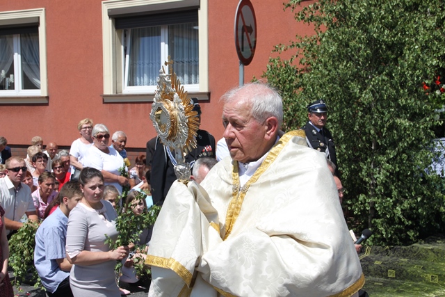 Po Mszy Świętej przed wystawionym Najświętszym Sakramentem, odmówiliśmy Litanię do Serca Jezusowego. Następnie wraz z Jezusem ukrytym pod postacią Chleba wyruszyliśmy w procesji do czterech ołtarzu. Krzyż, chorągwie, feretrony, poduszki z emblematami religijnymi niesione przez dzieci poprzedzały w procesji Jezusa ukrytego pod postacią Chleba niesionego w monstrancji. Tuż przed kapłanem niosącym monstrancje szły dziewczynki sypiące kwiatki. Pięknie przygotowane zostały ołtarze.
