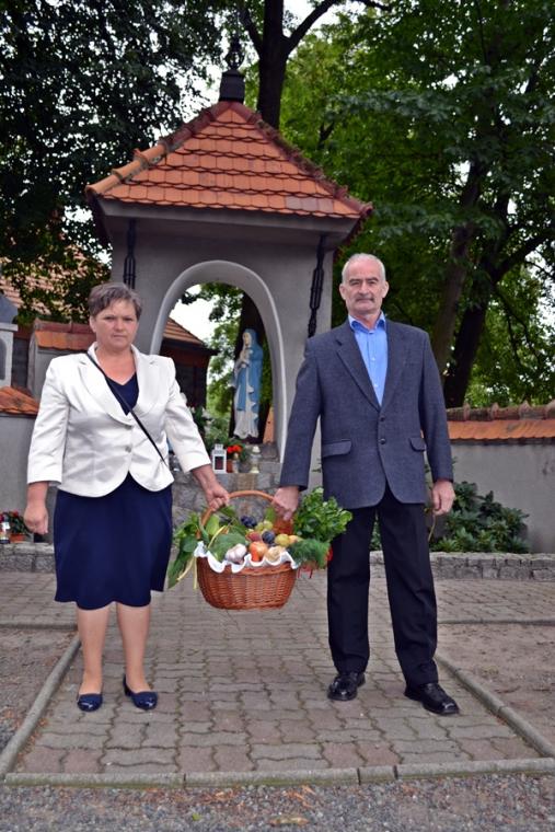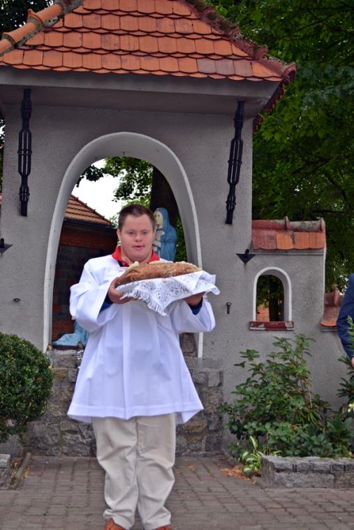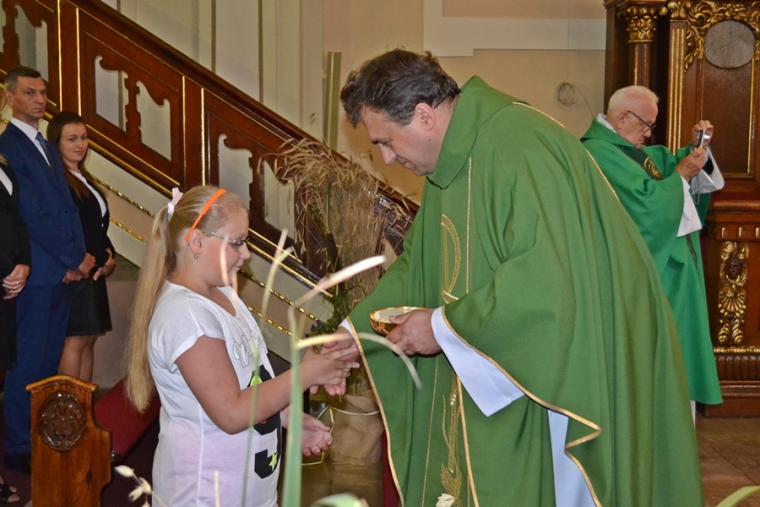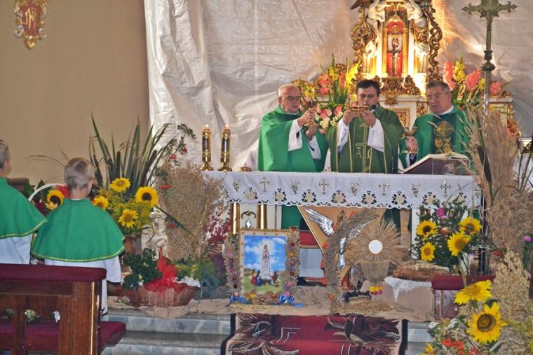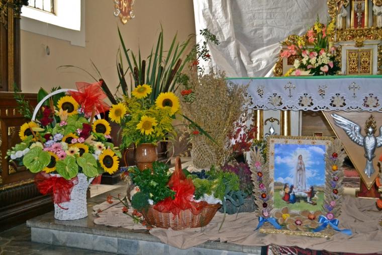 Przedstawiciele parafian z wieńcami żniwnymi, koszem kwiatów, koszem  owoców  i bochnem chleba zebrali się przy Grocie Matki Bożej, skąd procesjonalnie zostali wprowadzeni do kościoła. Wieńce żniwne symbolizują zebrany plon i koronują całoroczną pracę w polu.  Pierwszy wieniec nawiązywał do obchodzonego w tym roku Jubileuszu 100- lecia Objawień Fatimskich, drugi  został wykonany w kształcie kielicha i hostii.