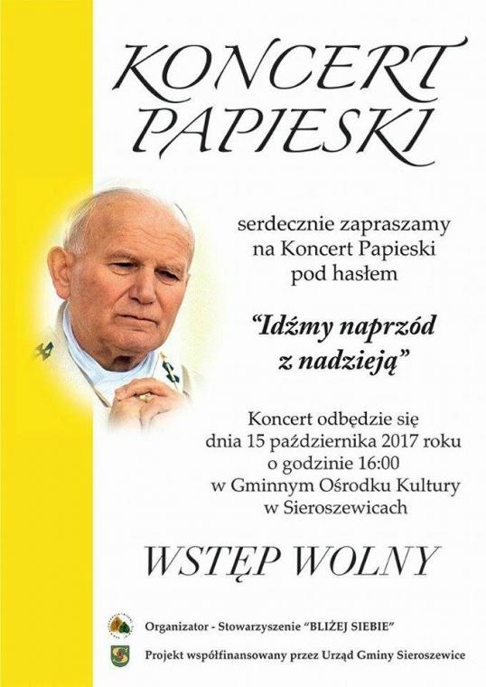 Dnia 15 października 2017 roku  już po raz siódmy w  gminie Sieroszewice(woj.wielkopolskie) organizowany jest Koncert Papieski. W tym roku  odbywa się on pod hasłem „Idźmy naprzód z nadzieją”. Pierwszy koncert odbył się w 2005 roku pod hasłem „Jan Paweł II – Orędownik prawdy” i miał miejsce w GOK w Sieroszewicach. Wystąpił wówczas  chórek dziecięcy i chór działający przy  parafii w Latowicach prowadzony przez  Panią Lucynę Ratajczyk oraz orkiestra dęta Ołobok pod kierownictwem Stanisława Jarosika. Gościem był zespół OR HAJIM. Następny koncert odbył się dopiero w 2011 roku pod hasłem „Encykliki Jana Pawła II” w kościele pw. Matki Boskiej Częstochowskiej w Latowicach, gdzie wystąpił chórek parafialny Aniołki Maryi prowadzony przez Arletę Kalińską i Annę Fornalczyk. Do roku 2013 czyli do momentu działania chórku koncerty organizowane były w kościele parafialnym w Latowicach. Po roku przerwy ponownie przystąpiono do organizacji koncertu, ale już z ramienia stowarzyszenia „Bliżej Siebie” z Sieroszewic z  nadzieją, że na stałe  zagości w kalendarzu imprez kulturalnych w Gminie.
