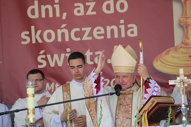 Prosił zgromadzonych, aby zaprosili do swojego życia Boga. - W to piękne święto Ciała i Krwi Pańskiej tutaj na ołtarzu składamy wszystkie troski, ale też przywary i błędy wypraszając Boże błogosławieństwo. Chciejmy Pana Boga zaprosić do naszych rodzin, do naszych serc, byśmy z mocą i siłą wytrwali w dźwiganiu codziennego krzyża, a to ziemskie pielgrzymowanie czy nam się podoba czy nie kiedyś skończy się – podkreślał kaznodzieja.