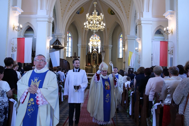 W latach 1886-1887 wybudowano obecny murowany kościół w stylu neogotyckim wraz z ołtarzami i organami, który konsekrowano w 1887 r. W 1929 r. ufundowano trzy dzwony. W latach 1941-1945 kościół został zamknięty, ograbiony i zdewastowany przez niemieckiego okupanta. Po wojnie świątynię odnowiono, a w 1959 r. przeprowadzono remont dachu i wieży. 30 lat temu, w setną rocznicę konsekracji kościoła, uroczystościom jubileuszowym przewodniczył prymas Polski kard. Józef Glemp. Od 2007 r. proboszczem parafii liczącej 1420 wiernych jest ks. kan. Rafał Mielcarek.