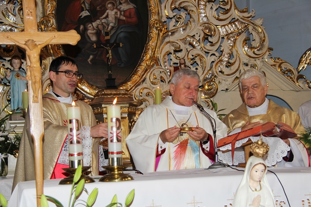 Wraz z biskupem kaliskim Edwardem Janiakiem Mszę św. koncelebrowali: ks. prał. Józef Nowacki, emerytowany proboszcz parafii pw. Zwiastowania NMP w Dębe i ks. dr Sławomir Kęszka, obecny proboszcz.