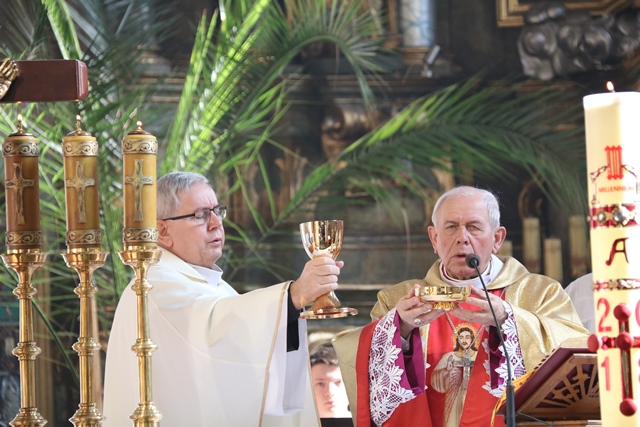 Podkreślał, że Eucharystia i Kościół są darami Miłosierdzia Bożego. - Przychodzimy, klękamy przed Jezusem w Najświętszym Sakramencie i chociaż Go nie widzimy, wierzymy i wchodzimy w milczącą obecność, którą On jest. W Kościele Miłosierdzie Boże jest udzielane w sakramentach świętych. Cieszmy się tymi darami – mówił bp Napierała.