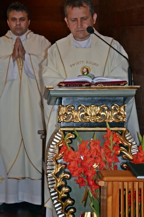 Dorośli parafianie i pielgrzymi przygotowują się do uroczystości odpustowych poprzez udział w mszach św.  podczas których,  głoszone są nauki. W tym roku głosi je ks. Sebastian Łagódka. W drugim dniu  przygotowań duchowych do uroczystości odpustowych o godz. 18:00 odmówiony  został różaniec. Dlaczego właśnie to modlitwa? Bo nasz niebieski patron był wielkim czcicielem Matki Bożej, a na naszym obrazie przedstawiony jest z różańcem zwisającym u pasa. Po różańcu odśpiewane zostały Godzinki o świętym Rochu Wyznawcy.  O godz. 18:30 rozpoczęła się Eucharystia, której przewodniczył ks. Sebastian Łagódka, zaś współcelebransem był ks. kan. Krzysztof Ordziniak. Podczas tej mszy świętej wierni wysłuchali kolejnej konferencji. Przypomnijmy, w pierwszej ksiądz rekolekcjonista skoncentrował uwagę na chrzcie, który  jest punktem wyjścia naszej wiary, zanurza nas w łasce Bożej. Zachęcał, byśmy rozbudzili w sobie pragnienia całkowitego zanurzenia naszego życia w Bogu. Ksiądz Sebastian zwrócił uwagę, że istnieje niebezpieczeństwo, że zamiast zanurzyć się w Bogu, przyjąć to co daje on nam każdego dnia, próbujemy stawia warunki. Podkreślił, że w dniu chrztu  zostaliśmy naznaczeni znakiem  krzyża, znak błogosławieństwa.  To właśnie znak krzyża stał się   myślą przewodnią czwartkowej konferencji. Kontynuując kaznodzieja nawiązał do znaku krzyża, którym naznaczony był święty Roch. Podkreślił, że krzyż był mocno obecny w jego życiu, także w postaci cierpienia. Kontynuując kapłan powiedział: „ Zostaliśmy naznaczeni krzyżem to znaczy, że nasza wiara nie może nigdy wyrzec się krzyża i nie może uciekać od krzyża”. Dzieląc się swoim spostrzeżeniem z kapłańskiej posługi zaakcentował, że ludzie czasami ulegają pokusie chrześcijaństwa bez krzyża. Polega ona na myśleniu, że jeśli będziemy chodzić do kościoła, modlić się, spowiadać regularnie to ominą nas w życiu wszystkie trudności. Gdy te trudności się pojawiają człowiek zaczyna robić Bogu wyrzuty, stawiać Bogu pytanie: dlaczego mi to robisz? Jest to efektem niewłaściwego pojmowania wiary. Nawiązując do słów Ewangelii podkreślił, że uczniowie Jezusa usłyszeli słowa o czekającym cierpieniu, ale nie usłyszeli o tym, że zmartwychwstanie. Kaznodzieja wskazał, że Jezus mówił o tym, że na drodze wiary jest krzyż. Zaakcentował, że nam potrzebny jest krzyż. Ksiądz Sebastian przywołał słowa papieża Franciszka: „Nie chciejcie Chrystusa bez krzyża. Chrystus bez krzyża nie jest zbawicielem jest tylko nauczycielem, jest tylko człowiekiem z dobrą prawdą”. Kontynuując ksiądz rekolekcjonista  podkreślił, że Zbawicielem jest ten, który umiera na krzyżu i zmartwychwstaje. Zaznaczył, że krzyż bez Chrystusa jest czymś co nas przygniata. W dalszej części konferencji ks. Sebastian zaznaczył, że człowieka prędzej czy później doświadczy krzyża. Zwrócił uwagę, że gdy chcemy zrobić coś dobrego, wymaga to od nas wysiłku, trudu, czynienie zła przychodzi nam znacznie łatwiej. Podkreślił, że cierpienie, śmierć są efektem zawiści diabła.