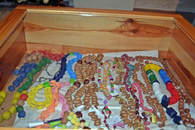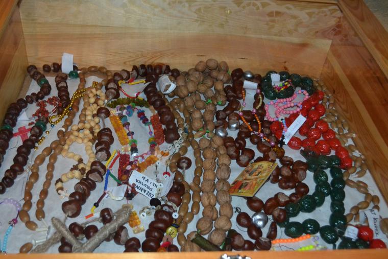 W kościele w gablotkach można obejrzeć wykonane przez dzieci różańce.