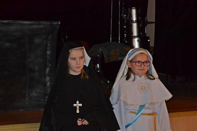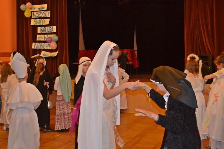 Tu  w MGOK- u odbył się mikstacki Bal Wszystkich Świętych. Tak jak na prawdziwym balu było zaproszenie do pierwszego tańca, który poprowadziła Maryja. Po pierwszym tańcu odbyła się prezentacja „ Świętych”  uczestniczących w balu. Najliczniejszą grupę stanowiły Anioły. Była na balu wspomniana już Maryja, były święte siostry zakonne, a wśród nich Apostołka Bożego Miłosierdzia Faustyna. Trzech chłopców przebrało się za św. Jana Pawła II. Na mikstackim Balu Wszystkich Świętych bawiły się m.in. św. Zofia, Jadwiga, Cecylia,  Marta, Matka Teresa z Kalkuty, ale także dzieci fatimskie.  Nie zabrakło Kacpra, Melchiora, Baltazara, św. Marka. Dobrze bawił się na balu pierwszy papież św. Piotr, który w dłoniach trzymał klucze. Był też założyciel Zgromadzenia Sióstr Franciszkanek Rodziny Maryi św. abp Zygmunt Szczęsny Feliński. Jego duchowe córki wcieliły się w postacie biblijne: Mojżesza i Nikodemy. Wszystkich Świętych uczestników mikstackiego trudno wymienić. Po prezentacji zabrzmiały ponownie dźwięki muzyki. Święci, to ludzi uśmiechnięci, więc kontynuowali radosną zabawę. Nie zabrakło konkursów i słodkości.