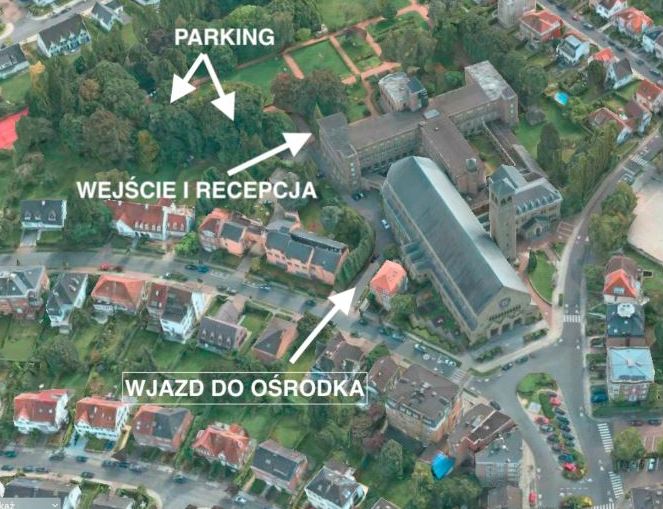 Wjazd i wejście do ośrodka znajduje się po lewej stronie kościoła jak również wjazd samochodów na parking. Wejście do budynku domu rekolekcyjnego i recepcji po schodach przy parkingu.