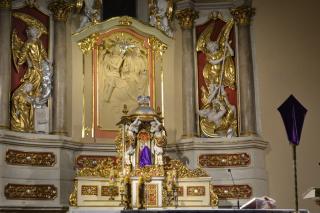 Po zakończonej Mszy Świętej, przy wystawionym Najświętszym Sakramencie zostało odprawione nabożeństwo ku czci Trójcy Świętej. Rozpoczęła je modlitwa nowennowa. To drugi miesiąc naszego trwania na Nowennie do Trójcy Świętej. Następnie odmówiona została Koronka. Ku niebu wraz z wonią kadzidła popłynęło wołanie: „Święty, Święty, Święty Pan Bóg zastępów. Pełne są niebiosa i ziemia chwały Twojej” na uwielbienie Trójcy Świętej, Ojca, Syn, Ducha Świętego. Była także okazja do tego, by w ciszy swego serca wypowiedzieć dziękczynienie. Po Koronce do Trójcy Przenajświętszej odmówiliśmy litanię. Błogosławieństwo Najświętszym Sakramentem zakończyło nabożeństwo. O zbliżających się obchodach przypomina nam baner umieszczony nad bramą wejściową do świątyni.