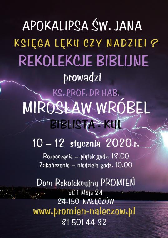 Rekolekcje Apokalipsa św. Jana - Księga lęku czy nadziei? będzie prowadził Ks. prof. dr hab. Mirosław Wróbel. Rekolekcje te będą okazją do odczytania losów naszego pokolenia i spojrzenia w przyszłość w świetle słowa Bożego. W każdym z nas jest oczekiwanie na spełnienie obietnic Boga i tęsknota za pokojem bez granic. Czy Apokalipsa zapowiada taki czas? Odpowiedz na to pytanie otrzyma każdy, kto w ciszy Domu Rekolekcyjnego PROMIEŃ, prowadzonego przez Zgromadzenie Sióstr Służek NMP Niepokalanej w Nałęczowie, zatrzyma się i zechce wziąć udział w tych rekolekcjach.