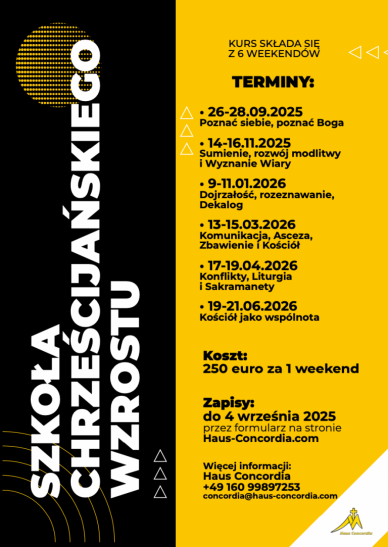 Polska Misja Katolicka w Niemczech zaprasza do udziału w Szkole Chrześcijańskiego Wzrostu – unikalnym programie formacyjnym obejmującym sześć intensywnych weekendów, które pomogą Ci rozwijać Twoją duchowość, intelekt oraz psychikę!To propozycja dla osób dorosłych, które pragną świadomie pogłębiać swoją wiarę, poszukują zrozumienia siebie i chcą wzrastać we wspólnocie.