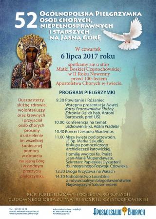 6 lipca, we wspomnienie Matki Bożej Uzdrowienia Chorych obędzie się 52. Ogólnopolska Pielgrzymka osób chorych, niepełnosprawnych i starszych na Jasną Górę organizowana przez Apostolstwo Chorych.