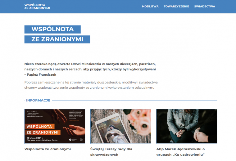 We współpracy z duszpasterzami osób pokrzywdzonych powstała strona internetowa wspolnotazezranionymi.pl. – Chodzi o to, żeby nie być obojętnym, żeby wspólnotę ze zranionymi budować w bardzo różnych przestrzeniach – przekonują jej inicjatorzy. Na stronie znajdują się propozycje modlitw, informacje o inicjatywach, świadectwa i kontakty do duszpasterzy towarzyszących osobom skrzywdzonym.