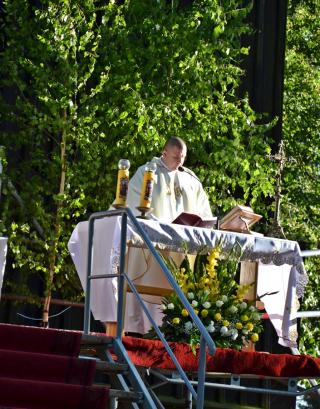 Homilię w czasie tej Eucharystii sprawowanej m.in. w intencji wszystkich obsługujących procesje i przygotowujących ołtarze wygłosił ks. kan. Krzysztof Ordziniak. Na początku kaznodzieja zauważył, że bardzo licznie zgromadzili się w tym dniu wierni w sanktuarium i wokół niego. Zaznaczył, że Chrystus, który jest bogaty w miłosierdzie pochyla się nad każdym człowiekiem, nad każdą ludzką nędzą ukazując mu swe serce pełne miłości. Ksiądz kan. Krzysztof podkreślił, że Bóg nieustannie zaprasza nas byśmy korzystali z Jego miłosierdzia, wskazując, że jest ono jedynym ratunkiem dla człowieka i świata. Zaznaczył, że współczesny człowiek bardzo potrzebuje Bożego przebaczenia, Bożej miłości i obecności. Doświadczenie Bożego miłosierdzia powinno mobilizować nas do miłości do Boga i bliźnich. Celebrans zwrócił uwagę, że Chrystus nieustannie mnoży dla nas swój Chleb. Gdy przyjmujemy Go w Komunii Świętej obdarza nas potrzebnymi siłami, doświadczamy Jego obecności, która jest źródłem otuchy, siły, odwagi.